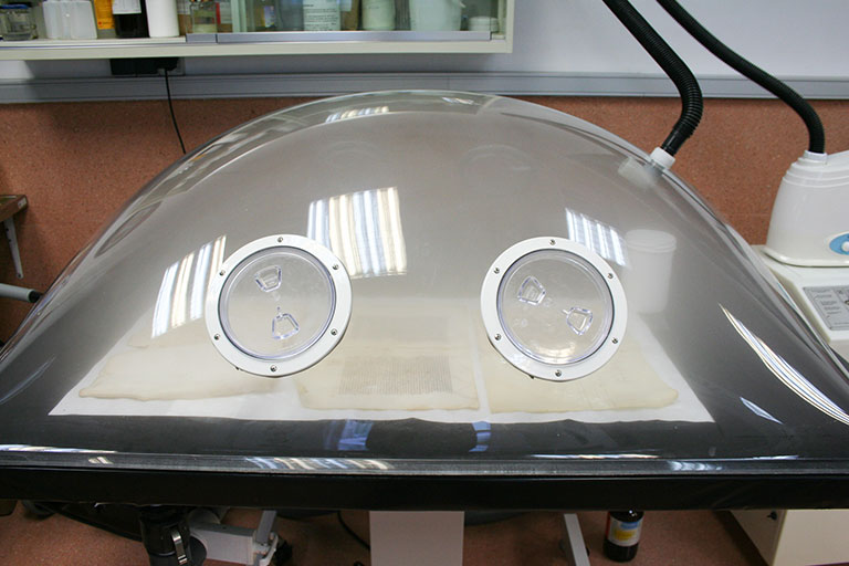 Los principales agentes de deterioro de nuestro patrimonio son insectos, hongos, roedores y tintas metaloácidas. Tras el análisis de los daños que producen y un acertado diagnostico se aplican los diversos tratamientos para curar y erradicar las causas y los daños. La limpieza, desinfección, hidratación, reintegración de soportes, consolidación, laminación y reencuadernación son tratamientos de restauración que se aplican en estas instalaciones, siempre siguiendo los criterios y normativas vigentes internacionalmente.